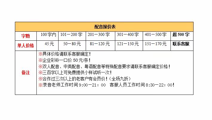 (4)小样:三百字以上稿件我们免费提供小样试听很少。三百字以内的需加费用!(具体跟客服确定)