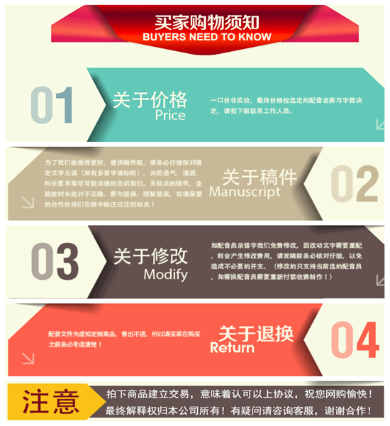 10、非常優(yōu)秀售后:如果在成品中出現因我們的配音而造成的錯讀、漏讀或與試音感覺不符等情況,我們將免費為您服務到您滿意為止。如因您的稿件再次修改而造成的問題,我們將根據情況酌情考慮免費或收費修改,詳詢我們的客服人員。