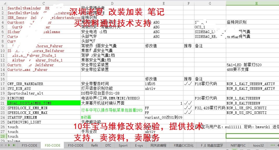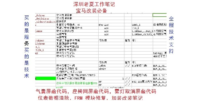 寶馬加裝改裝工作筆記,10年寶馬維修改裝經(jīng)驗(yàn),氣囊屏蔽代碼,座椅網(wǎng)屏蔽代碼,儀表數(shù)據(jù)清除VIN清除,CIC網(wǎng)關(guān)改NBT網(wǎng)關(guān)編程,證書清除,TOOLS32應(yīng)用,漢化中文等等。