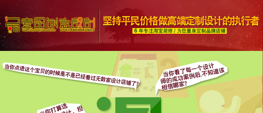 【關(guān)于壹品創(chuàng)意】壹品創(chuàng)意設(shè)計(jì)從創(chuàng)辦之初,就堅(jiān)持著“做高端定制設(shè)計(jì)”的理念,現(xiàn)如今,已經(jīng)由幾個(gè)設(shè)計(jì)師創(chuàng)共同經(jīng)營(yíng)的店鋪發(fā)展為多個(gè)專業(yè)化團(tuán)隊(duì)共同協(xié)作的線下工作室。目前,壹品創(chuàng)意工作室擁有客服、創(chuàng)意、拍攝、制作、推廣等多個(gè)部門,不僅能夠滿足客戶的定制需求,而且可以為客戶提供一體化服務(wù)。主要的設(shè)計(jì)服務(wù)有店鋪裝修定制設(shè)計(jì),寶貝描述視覺(jué)定制,海報(bào)設(shè)計(jì),圖片處理等,我們只專注做高端定制設(shè)計(jì)