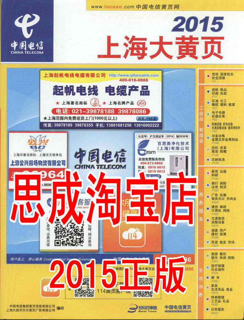 正版2015年全新中國(guó)電信上海大黃頁(yè)電話號(hào)簿企業(yè)名錄大全