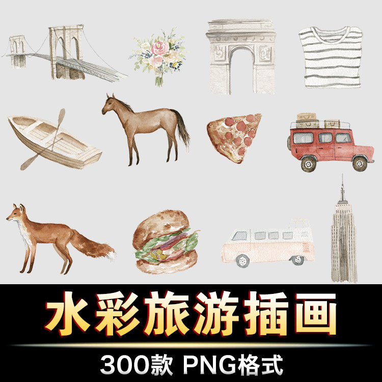 手繪水彩美食奶茶飲品歐式建筑交通工具旅游地圖插畫(huà)PNG手賬素材
