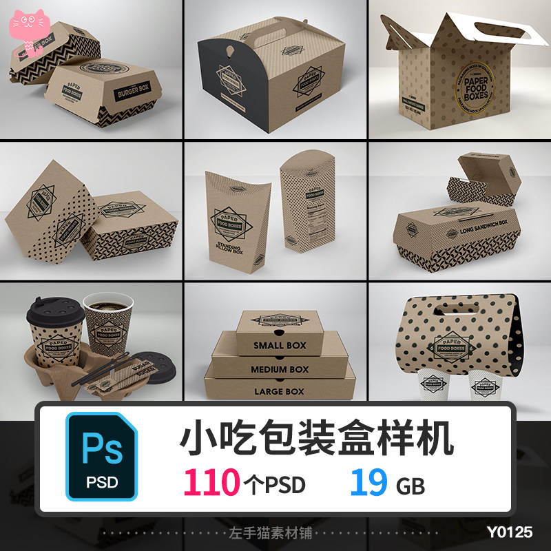 快餐外賣小吃包裝紙盒披薩漢堡蛋糕奶茶貼圖樣機效果圖PSD刀模圖