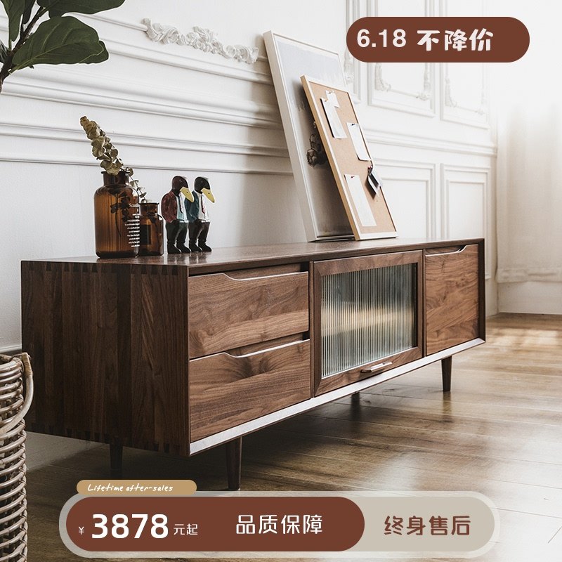 特維爾視聽柜 北歐實(shí)木家具黑胡桃木兩抽玻璃門影音柜1.8米電視柜