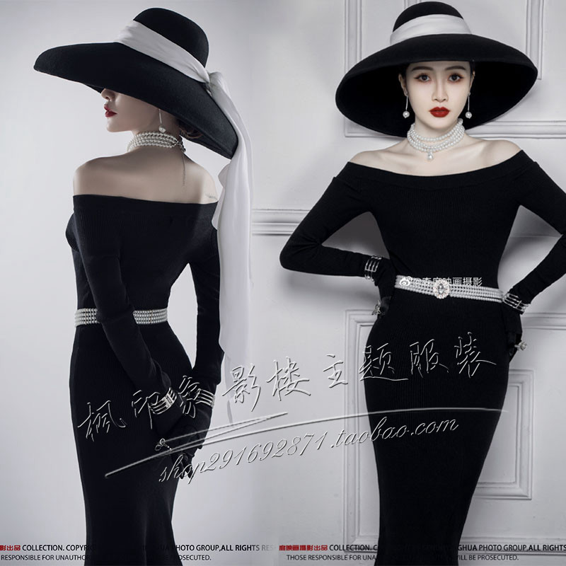 影樓主題新款赫本法式一字肩黑色修身小禮服個(gè)人拍照攝影服裝