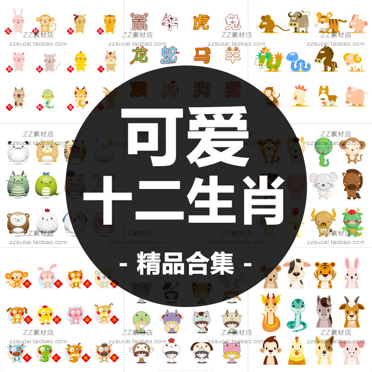 卡通可愛Q版中國春節(jié)十二生肖鼠牛虎兔動物圖標LOGO設(shè)計矢量素材