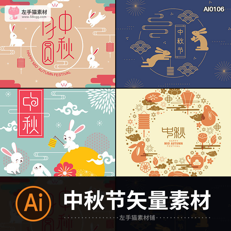 中秋節(jié)插畫(huà)元素海報(bào)燈籠玉兔月餅盒包裝圖案背景AI矢量設(shè)計(jì)素材圖