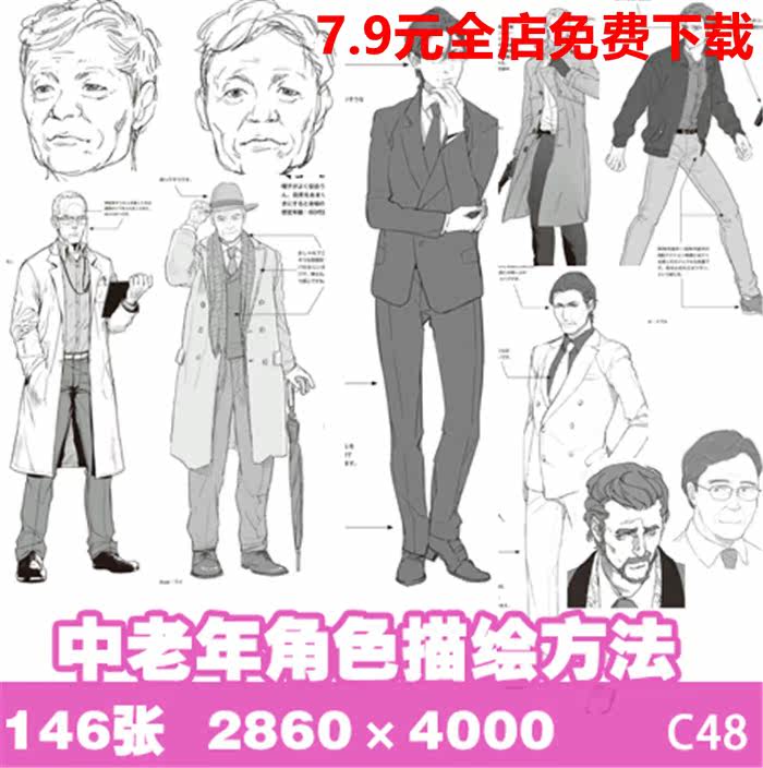 漫畫人物 線稿動漫中老年角色描繪方法 CG原畫 繪畫姿態(tài)參考 素材