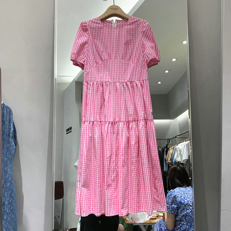 8090服飾B21262-3法式小眾設(shè)計(jì)色織格紋泡泡袖高腰顯瘦心機(jī)連衣裙