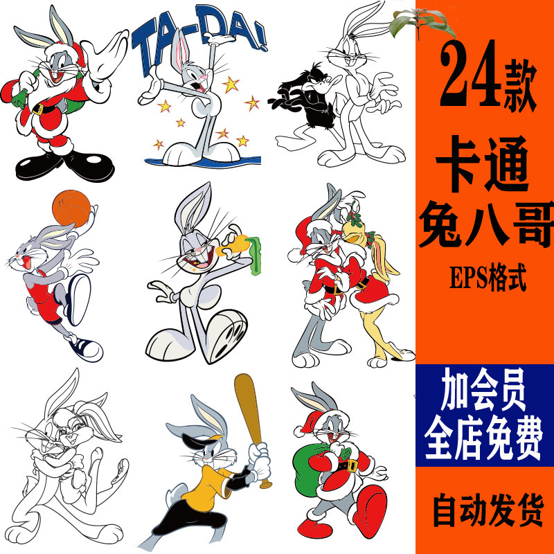 卡通動畫兔八哥兔子熱轉印燙畫服裝T恤印花圖案AI矢量圖設計素材