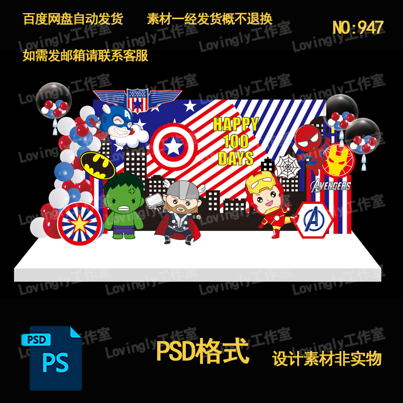 復仇者聯(lián)盟漫威動畫主題寶寶宴氣球生日背景墻板設計稿素材效果圖