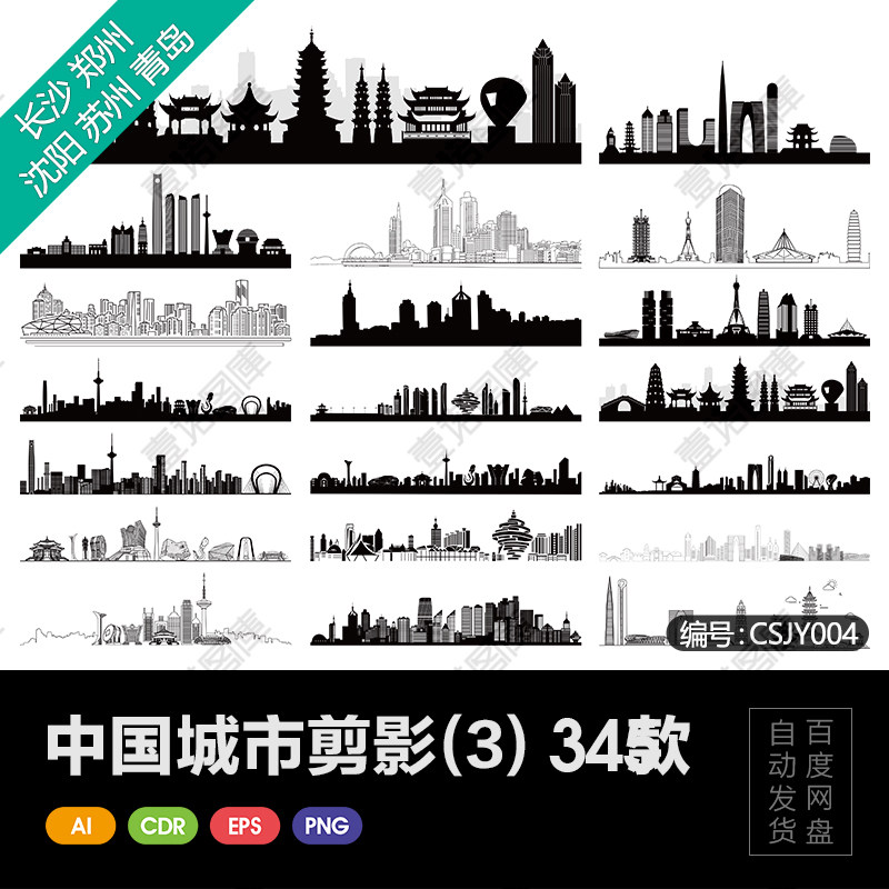 長(zhǎng)沙鄭州沈陽(yáng)蘇州青島中國(guó)城市地標(biāo)建筑剪影輪廓AI矢量圖設(shè)計(jì)素材