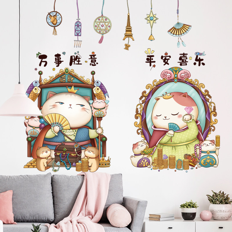 可移除墻貼紙貼畫招財貓裝飾墻壁紙自粘店面裝修布置墻上卡通臥室
