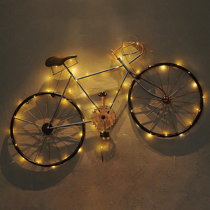 燒烤店裝飾品掛件復古裝修立體掛上墻的工藝品發(fā)光鐵藝自行車壁掛