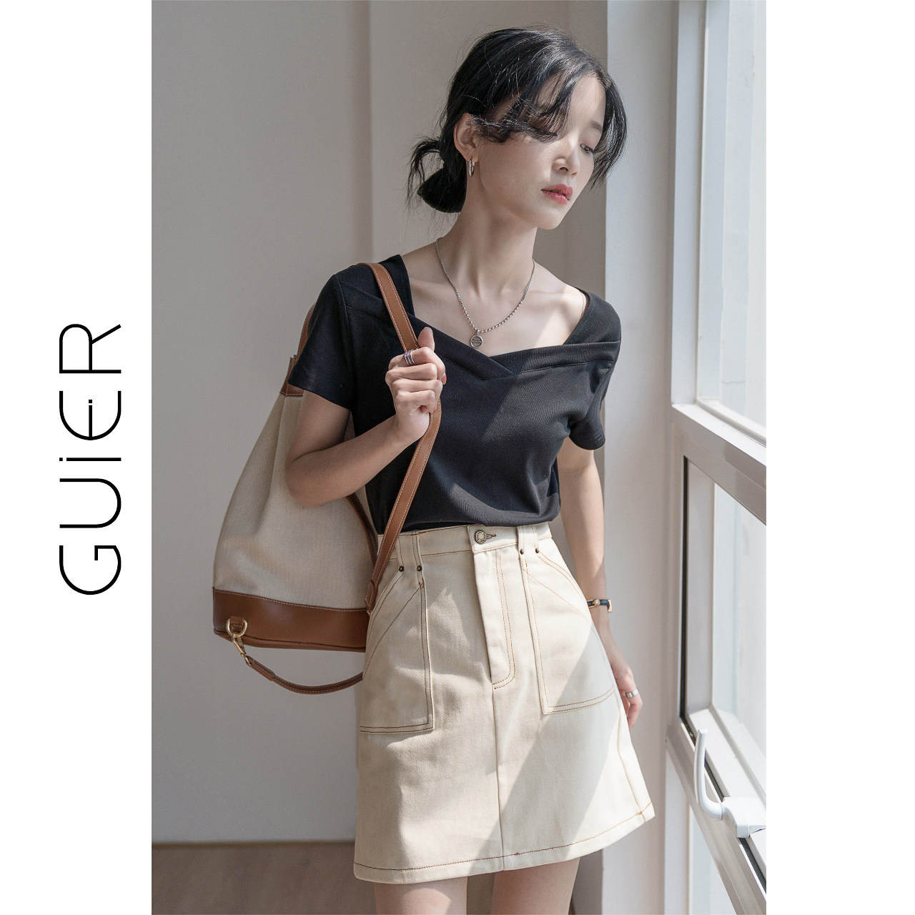 「GUIER」方領(lǐng)純色短袖t恤女2021年新款夏季小心機(jī)設(shè)計(jì)感鎖骨上衣