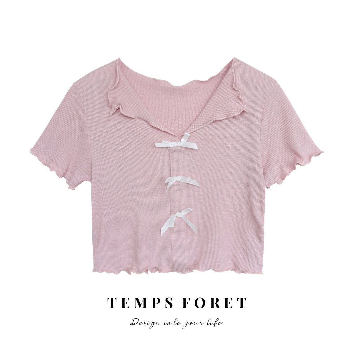 拾野森 夏裝別致bm風(fēng)短款小眾設(shè)計(jì)感蝴蝶結(jié)木耳邊翻領(lǐng)V領(lǐng)T恤上衣