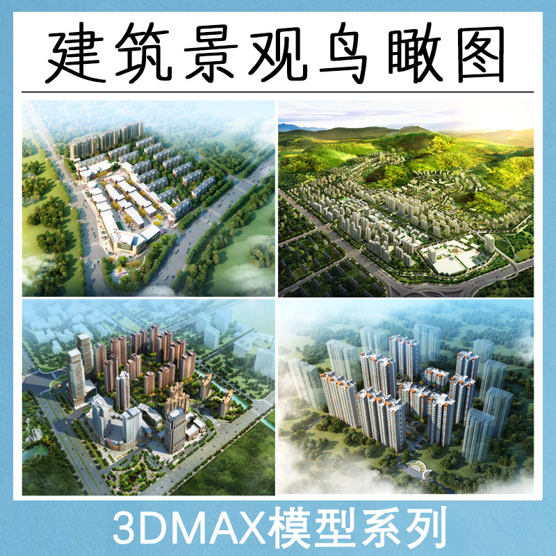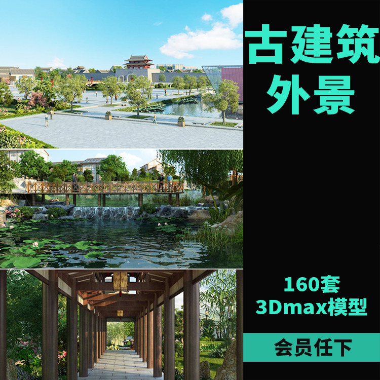 中式古建筑外立面3dmax模型 公園河流湖泊景觀鳥瞰3d模型