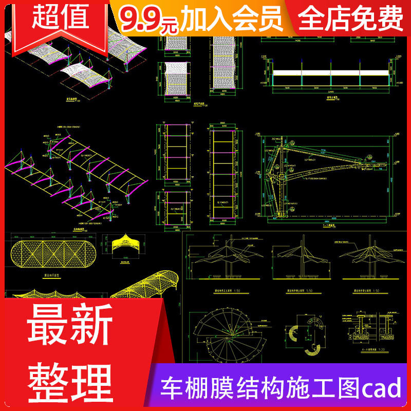 公園廣場(chǎng)園林景觀小品膜結(jié)構(gòu)亭遮陽(yáng)棚CAD施工圖平面立面剖面詳圖