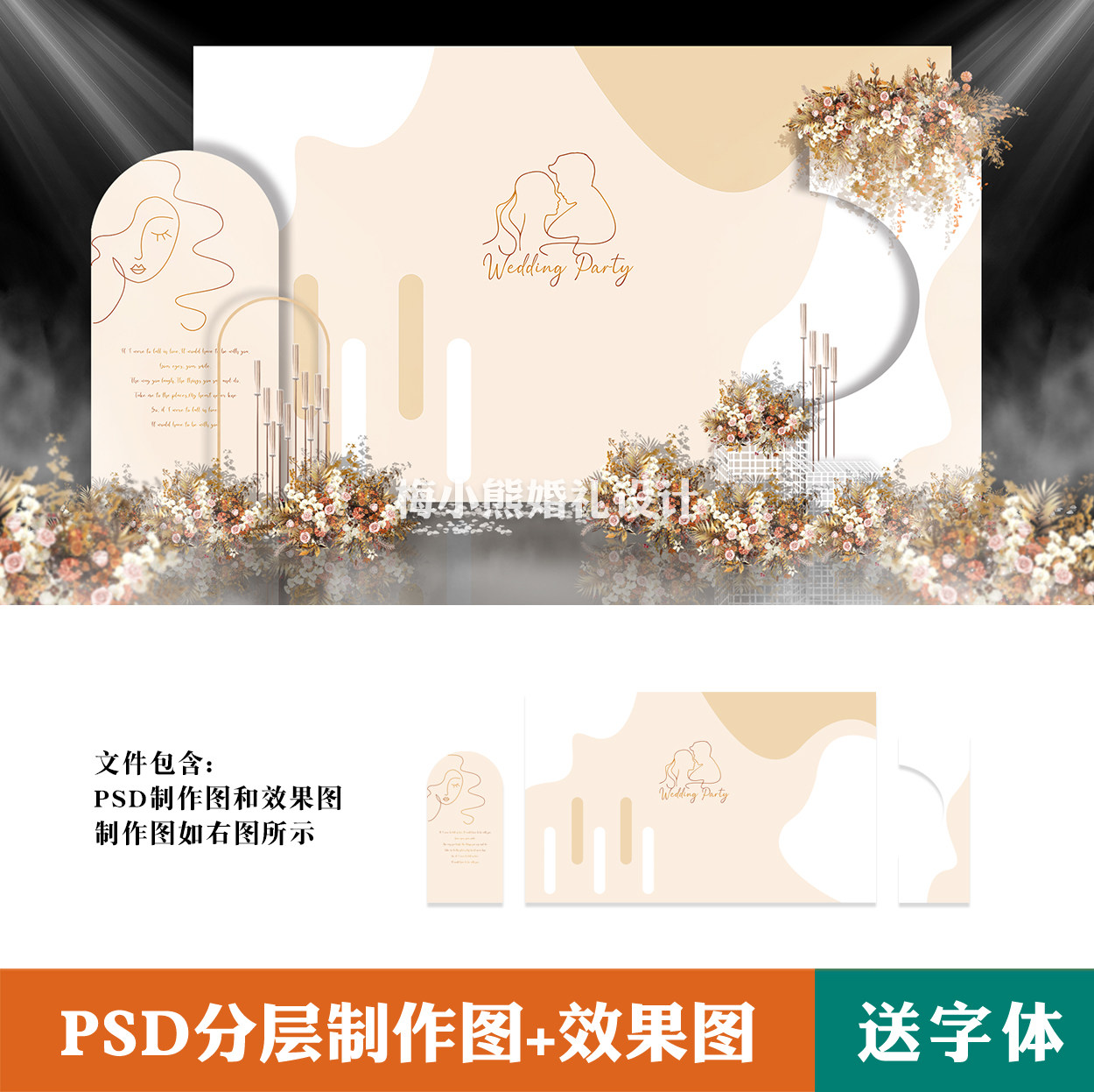香檳白色極簡風卡其色婚禮背景墻設(shè)計 婚慶效果圖噴繪KT板PSD素材