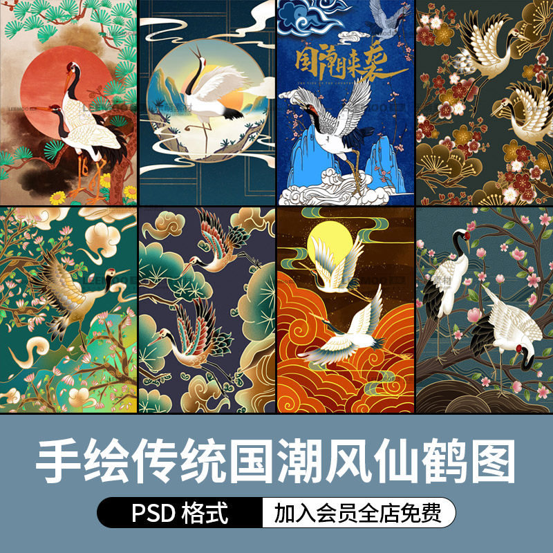 國潮風新中式古典復(fù)古仙鶴手繪插畫日式海報背景psd模板設(shè)計素材