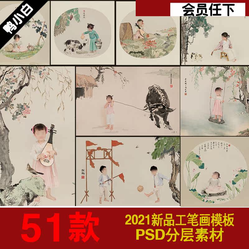 【鴨小白】2021牛年新款兒童工筆畫psd古風兒童古裝素材PSD模板PS