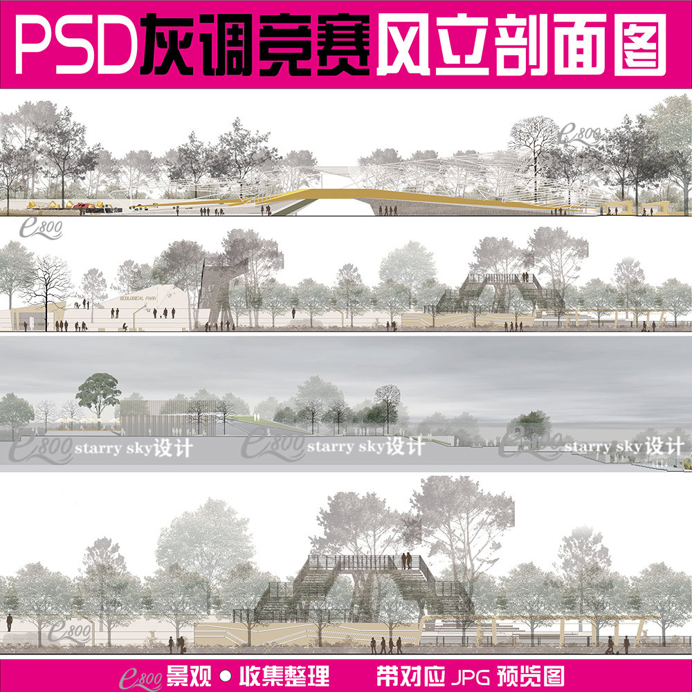 灰色調(diào)競賽風(fēng)PS景觀立面剖面圖PSD公園兒童區(qū)園林分層素材