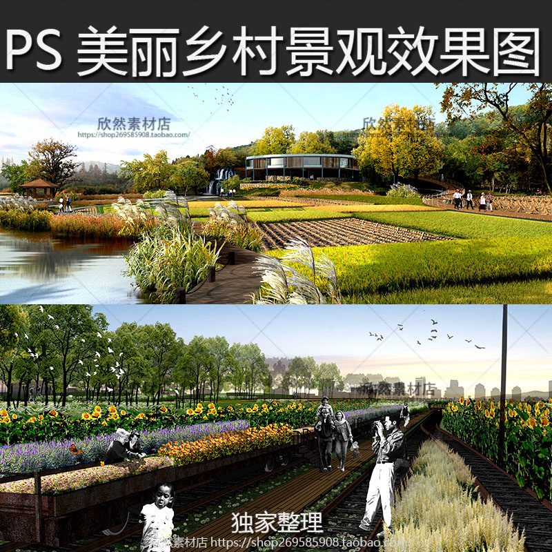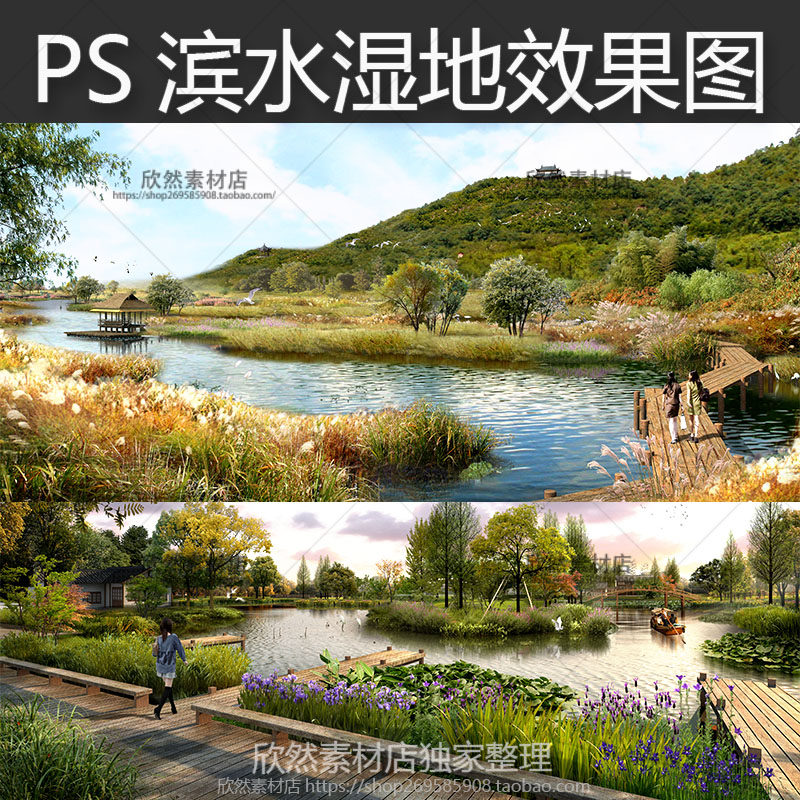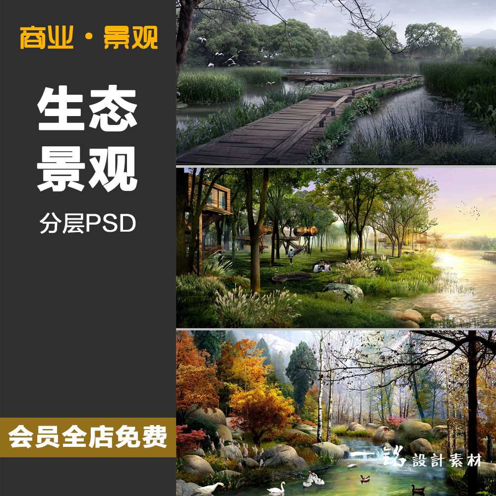 景觀園林鄉(xiāng)村觀光濱水濱河濕地公園廣場風景效果圖psd素材模板