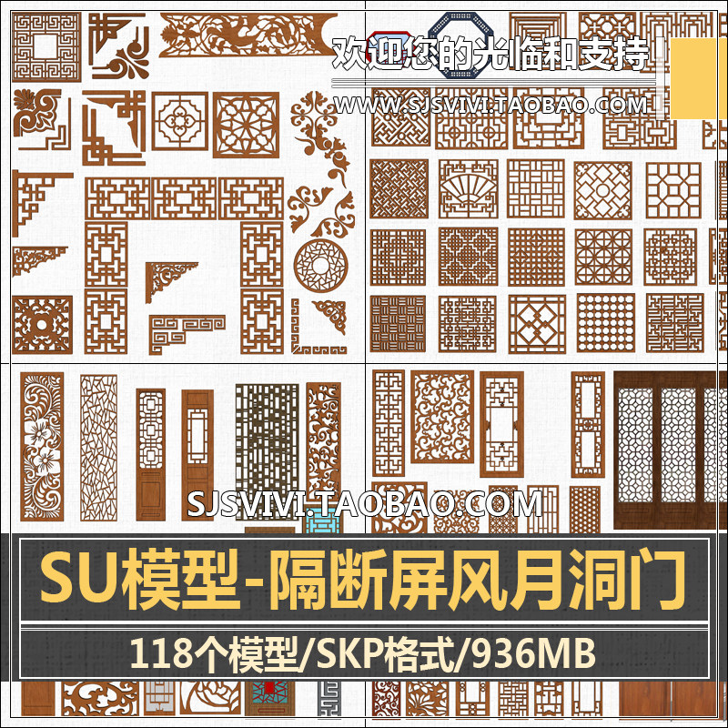 室內(nèi)中式風(fēng)格家裝工裝雕花隔斷屏風(fēng)草圖大師su模型月亮門(mén)花窗裝飾