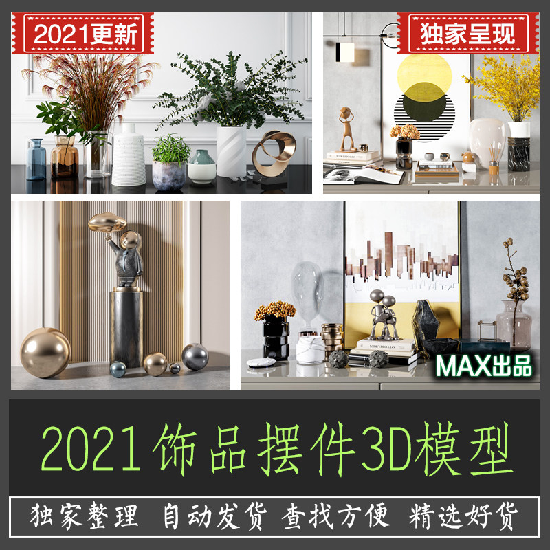 2021軟裝3D模型裝飾品擺件陳設(shè)品書(shū)籍花瓶雕塑單體組合3DMAX