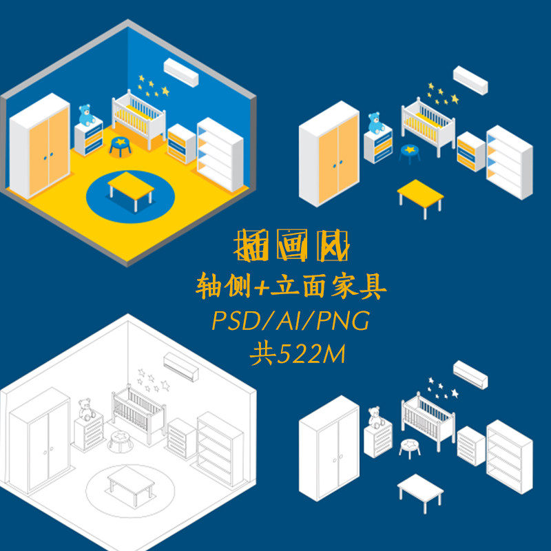 插畫風(fēng)彩色家具配景PS矢量家具素材AI立面軸側(cè)室內(nèi)設(shè)計(jì)扁平化分析