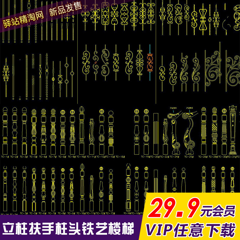 室內(nèi)設(shè)計(jì)鋼木樓梯立柱扶手柱頭cad 鐵藝樓梯欄桿cad配件圖塊素材