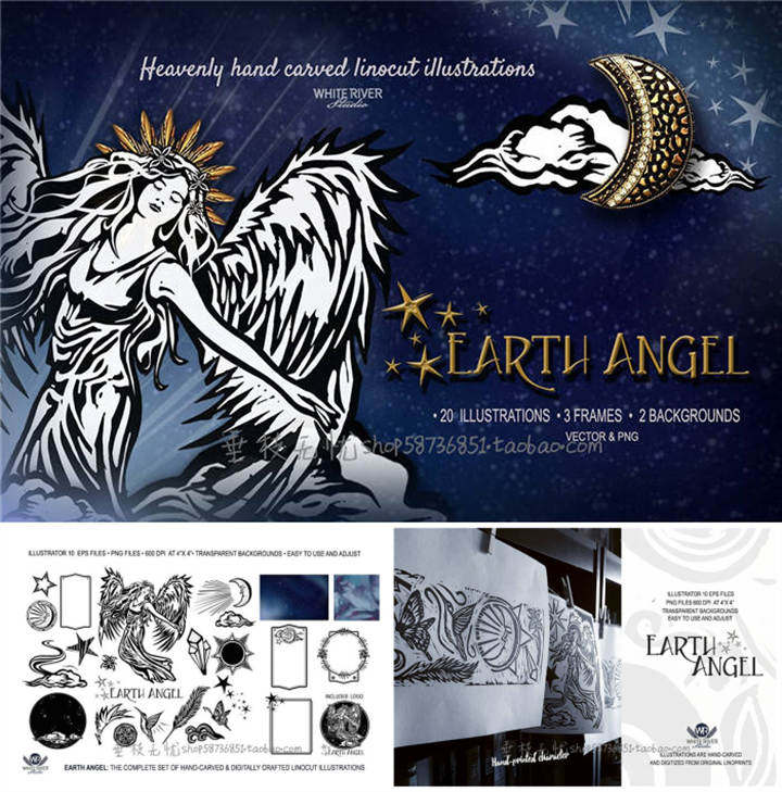 A1227矢量雕刻風(fēng)格天使月亮星星云朵線稿插畫 AI設(shè)計(jì)素材+png