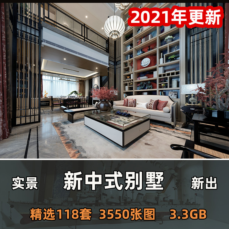 2021年新中式風格別墅裝修設(shè)計效果圖紙案例復試挑空室內(nèi)高清實景