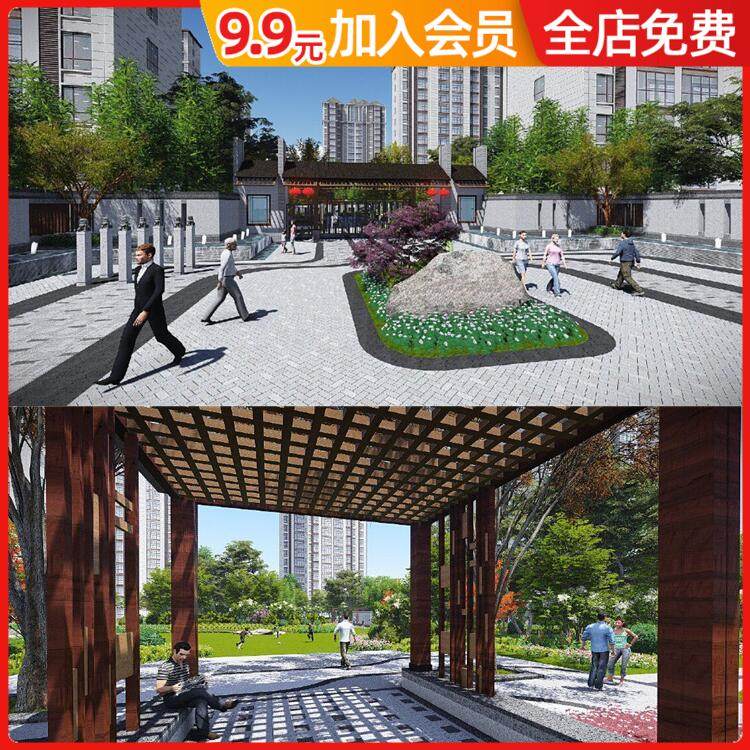 新中式住宅小區(qū)居住區(qū)建筑景觀大門主入口廊架景墻草圖大師SU模型