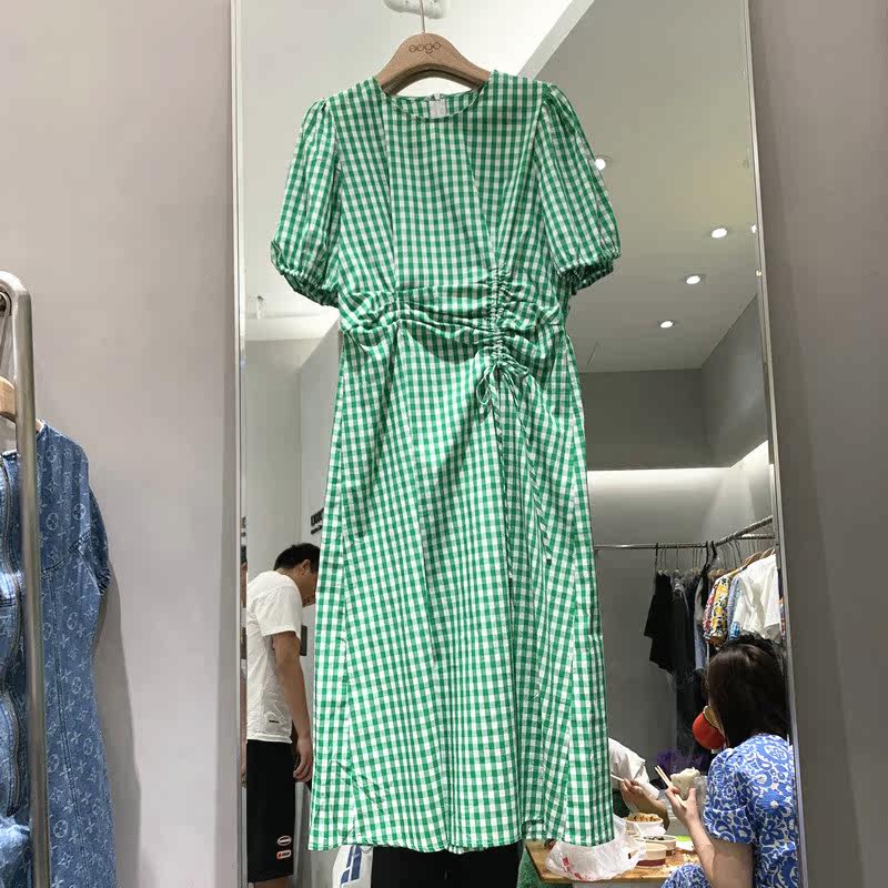 8090服飾B21277不規(guī)則設(shè)計(jì)感抽繩法式格子連衣裙顯瘦收腰泡泡袖夏主營(yíng):