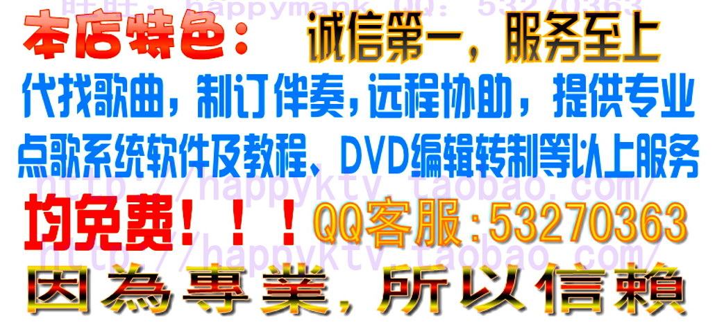需要更新KTV歌庫和喜愛唱K、收集KTV/MTV歌曲的朋友請(qǐng)用郵件或直接店主,留言必回!購買就送!無起拍價(jià)!購買零風(fēng)險(xiǎn)!點(diǎn)數(shù)用完再付款!如遇到下載速度慢、歌曲不全、不能切換原唱伴唱等原因造成您的不滿,本店可全額退款!歡迎各界KTV運(yùn)營商、點(diǎn)歌機(jī)VOD銷售商及K迷、歌迷等朋友光臨本店!感謝大家的支持!
