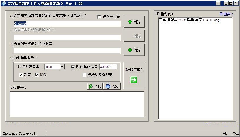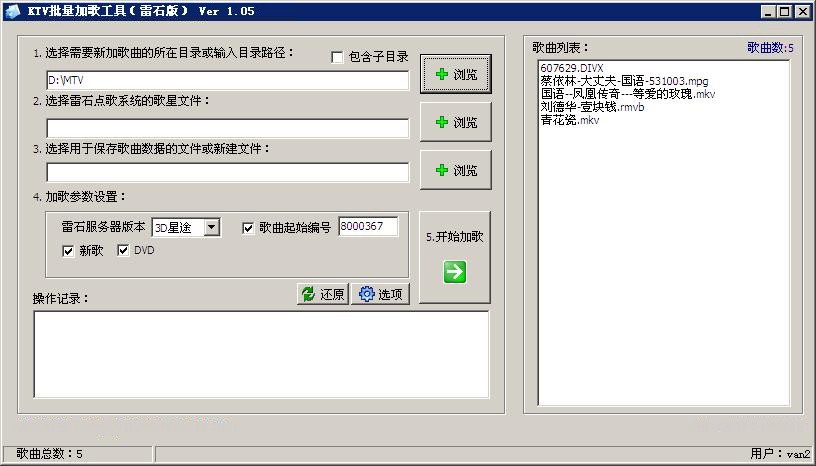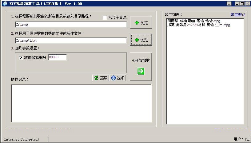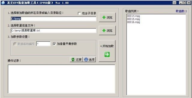 VOD影音點歌系統(tǒng) 批量加歌工具 支持雷石傳奇/星途/3D 等版本,視易魔界、魔方、魔云、鋒云等版本,陽光視翰8.0、9.0、10.0、機頂盒版和PC機版、前沿IP(咨詢特價)、3D、奧斯卡7.0、8.0,海媚V8V9、天行視點寫頭版等各大VOD影音點歌系統(tǒng)運營商的KTV歌庫批量加歌入庫。可根據(jù)客戶要求制定批量加歌入庫工具,讓您的KTV場所加歌更加簡單快捷!