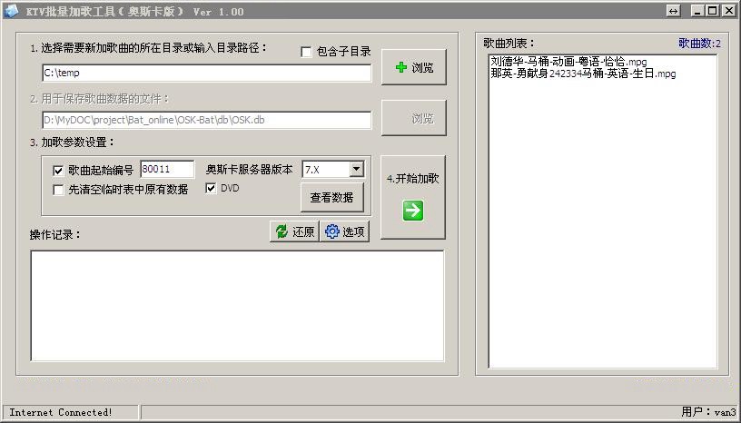 5. 使用時必須連接互聯(lián)網(wǎng)。此加歌過程可以在任一臺電腦上操作(不需要在服務(wù)器),操作完成后再將歌曲拷到服務(wù)器上導(dǎo)入。狗版需要插狗運行,不限制任何電腦;