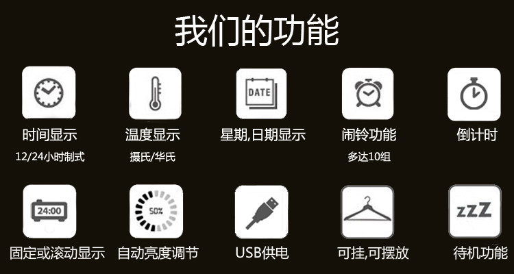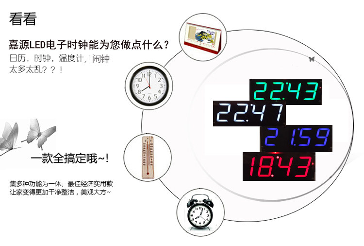 跟其他同類鬧鐘產(chǎn)品比我們的特點是大,1.8寸數(shù)碼管的字高足有5.6cm,上常見1寸的產(chǎn)品高度是3.3cm。。。非常少創(chuàng)造的旋轉(zhuǎn)顯示功能可方便電源線的放置