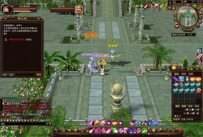 增加了2888武圣卡獎勵,可于大理出生地找都大爽領取,本次2888武圣卡獎勵跟官方獎勵接近,從1級到100級,獎勵寶總額(咨詢特價)寶,6級紅寶石3顆,4級紅寶石兩顆,其他還有大還丹若干,各級新莽神符,行囊包裹等等,取消贈點獎勵.領取各級獎勵時,請盡量保持道具欄有8個以上空格,以免遺漏