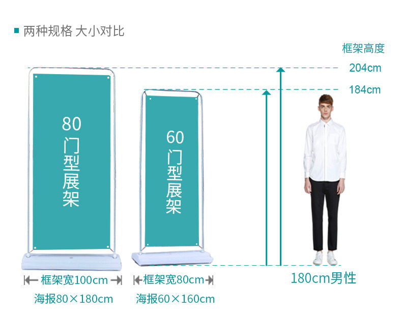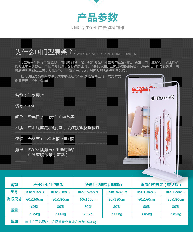 • 颜色分类:60X160PP海报印刷(不含展架)80X180PP海报印刷(不含展架)60X160PVC海报印刷(不含展架)80X180PVC海报印刷(不含展架)加重铁门型展架60X160(白色,净重2.50KG)加重铁门型展架80X180(白色,净重3.00KG)豪华铁门型展架60X160(白色,净重3.05KG)豪华铁门型展架80X180(白色,净重3.85KG)豪华铁门型展架60X160(黑色,净重3.05KG)豪华铁门型展架80X180(黑色,净重3.85KG)豪华铁门型展架60X160(金色,净重3.05KG)豪华铁门型展架80X180(金色,净重3.85KG)注水型门型展架60X160(灰白,净重2.35KG)注水型门型展架80X180(灰白,净重2.60KG)