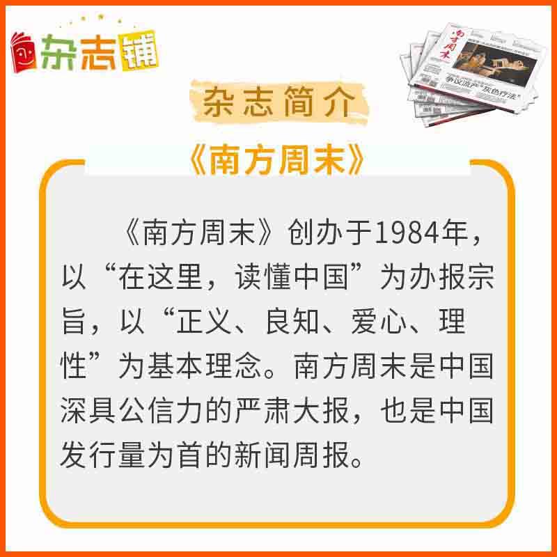 南方周末報(bào)紙訂閱 2022年1月起訂全年訂閱 1年52期 雜志鋪時(shí)事熱點(diǎn)新聞周報(bào)經(jīng)濟(jì)文化報(bào)刊時(shí)政要聞評(píng)論新萎好者讀物財(cái)經(jīng)商業(yè)資訊