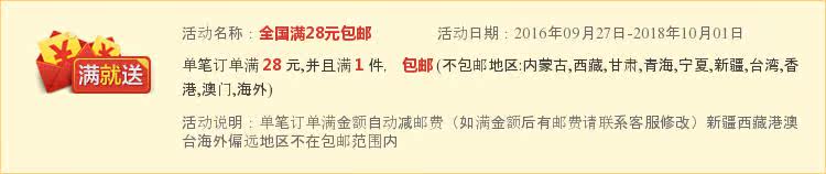 - 單筆訂單滿28,并且滿1件,包郵,(包郵地區(qū):北京,天津,河北,山西,內(nèi)蒙古,遼寧,吉林,黑龍江,上海,江蘇,浙江,安徽,福建,江西,山東,河南,湖北,湖南,廣東,廣西,海南,重慶,四川,貴州,云南,西藏,陜西,甘肅,青海,寧夏,新疆)