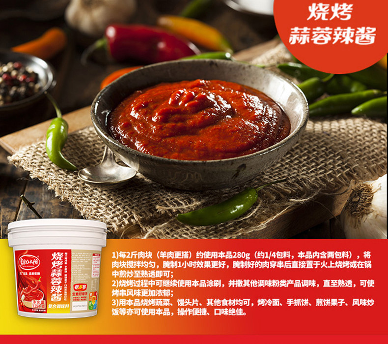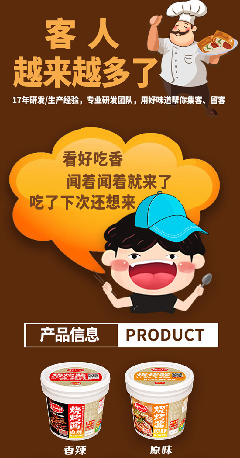 - 口味:1kg原味燒烤醬2包(送腌料+刷子)1kg香辣燒烤醬2包(送腌料+刷子)1kg原味1包+1kg香辣1包(送腌料+刷子)【現(xiàn)貨批發(fā)】原味整箱1kg*8包【現(xiàn)貨批發(fā)】香辣整箱1kg*8包【現(xiàn)貨批發(fā)】拼箱(原味4包+香辣4包)1kg原味單包(送刷子)1kg香辣單包(送刷子)桶裝-原味2.25kg(送腌料+刷子)桶裝-香辣2.25kg(送腌料+刷子)桶裝-新奧爾良2.25kg(送腌料+刷子)桶裝-黑椒2.25kg(送腌料+刷子)桶裝-蒜蓉辣醬2.25kg(送腌料+刷子)桶裝-煎餅果子醬2.25kg(送刷子)桶裝-烤冷面醬2.25kg(送刷子)桶裝-手抓餅醬2.25kg(送刷子)