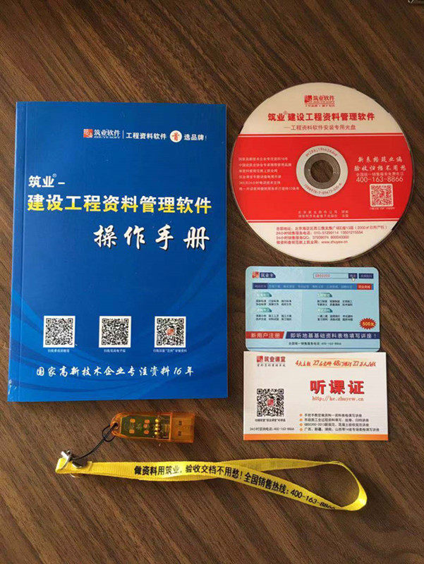 軟件說明書、加密狗、軟件光盤、產品精美包裝盒、贈送(咨詢特價)筑業(yè)卡