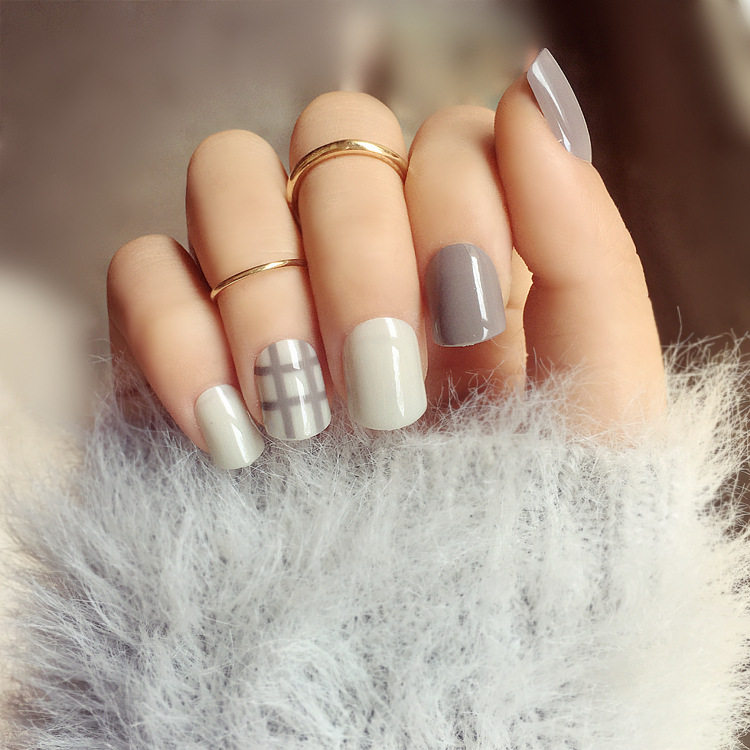 显手白浅蓝色格纹胶水款美甲贴片 成品美甲 小短款办工假指甲包邮