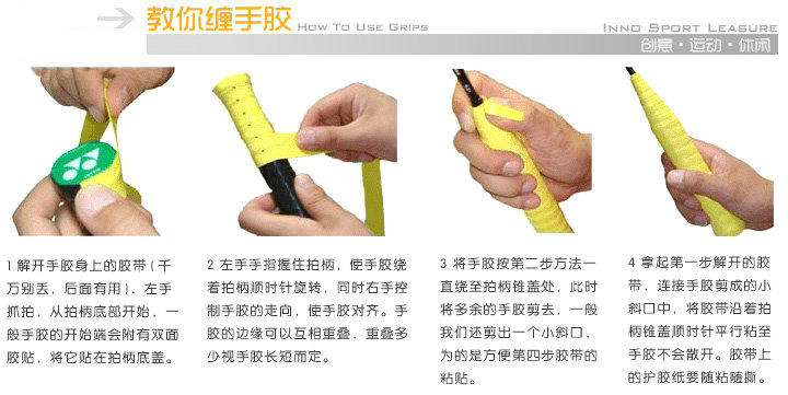 手膠的纏裹很容易,一般從拍柄底部開始,一定要選擇好纏繞的方向,這個(gè)很容易,試一下就可以辨別出正確的方向。纏繞的時(shí)候注意用力要均勻,不要纏得太松,也不要拉的太緊,否則膠皮會(huì)被拉薄,影響膠皮壽命。一般纏完拍柄錐部之后就算完成了,余下膠皮部分可以剪掉,然后用手膠附帶的固定膠帶把收尾部分固定就可以了。如果覺得固定膠帶不夠用,可以用黑色的電工用絕緣膠帶來加固。