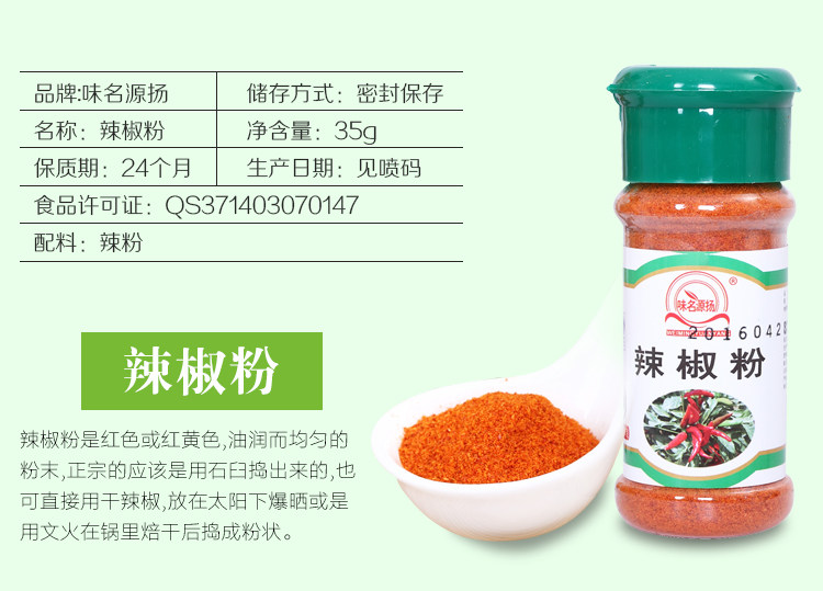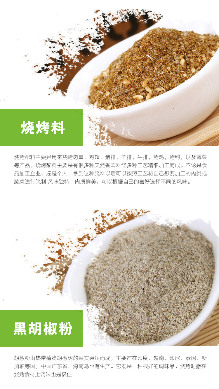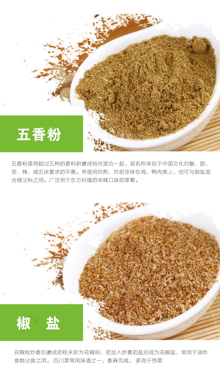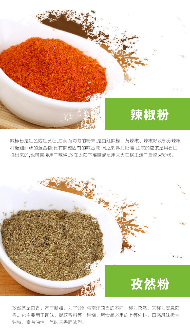 - 配料表:辣椒粉、五重粉、黑胡椒粉、椒鹽、燒烤料、孜然粉