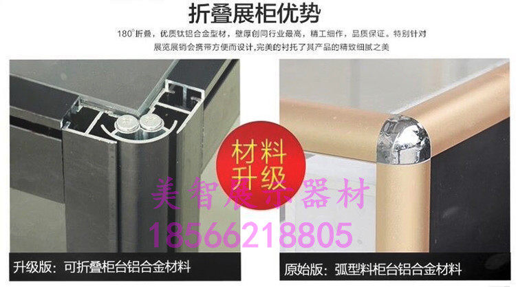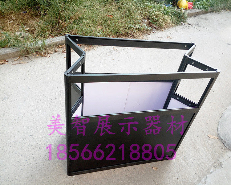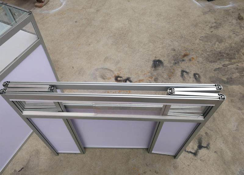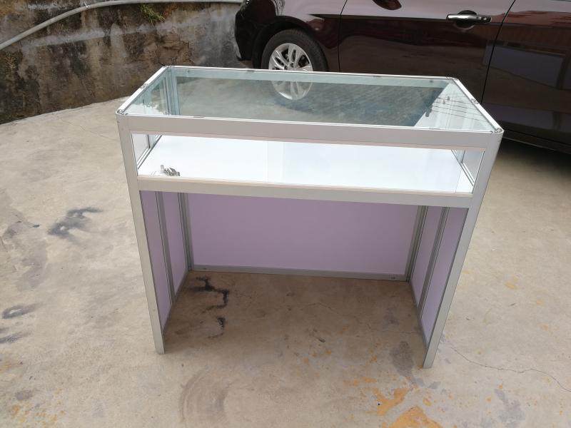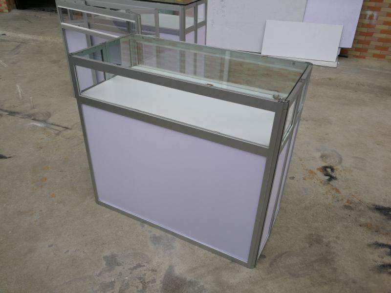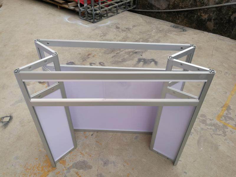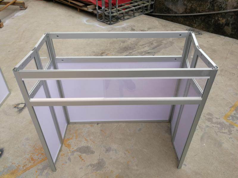 展会展位专用洽谈台、铝合金折叠洽谈台、折叠展示柜是采用国际标准优质铝材和展板制作而成,主要组成材料包含:铝合金圆弧柱 ,扁铝(32单槽扁铝、40双槽单筋扁铝、50四槽扁铝),三卡锁,调节脚,封盖,展会专用PVC展板/高密度板,层板挂钩,T字螺丝,梅花扳手等;形状有方形柜式接待台、正方形式洽谈台,