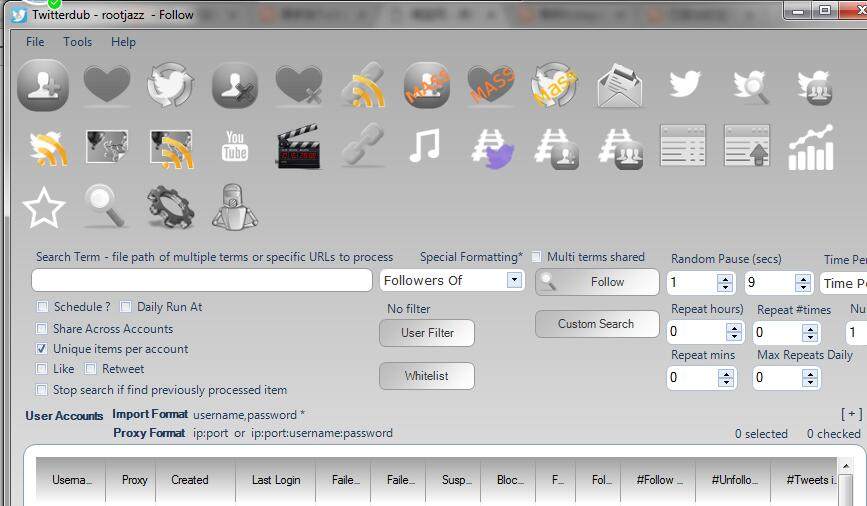 目前國外支持多賬戶操作的T網(wǎng)站營銷軟件,可以在自動follow /unfollow,自動like(點贊),自動轉(zhuǎn)發(fā)等,支持多賬戶操作和管理,支持代理和第三方收費打碼服務接口。